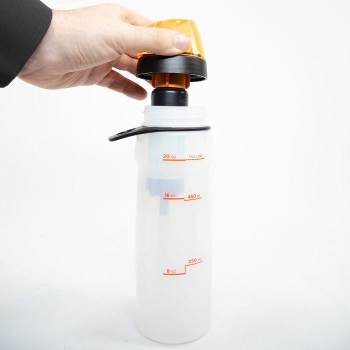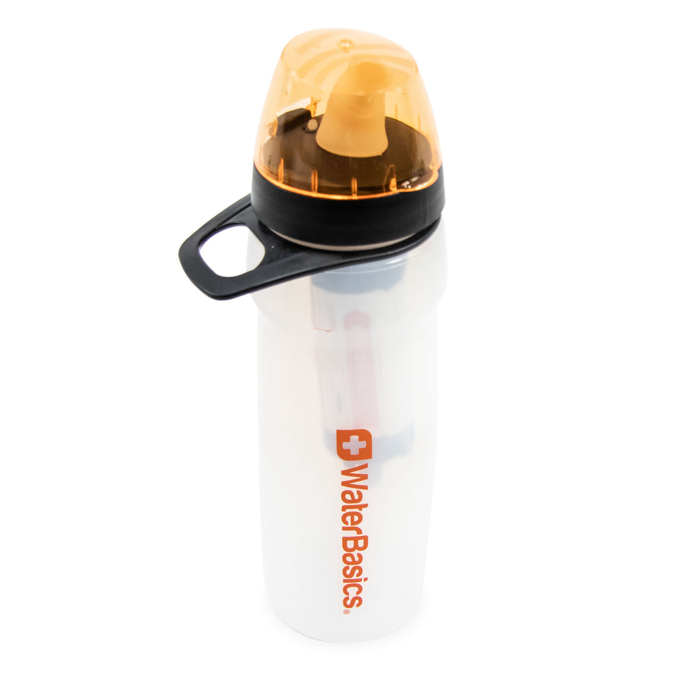 The WaterBasics GRN Line Filter Water Bottle keeps you safe from waterborne illness when you need it. Easily refill it over 500 times from any natural water source or questionable municipal water supply. The bottle includes a convenient finger ring for easy filling and carrying. The bite valve says clean thanks to the rigid dust cap. Squeeze the bottle to assist the flow of water through the filter. The bottle comes with a Series II GRN Line Filter and is certified to EPA and NSF/ANSI standards for the removal of bacteria, Cryptosporidium, Giardia, chlorine, chemicals, taste and odor.